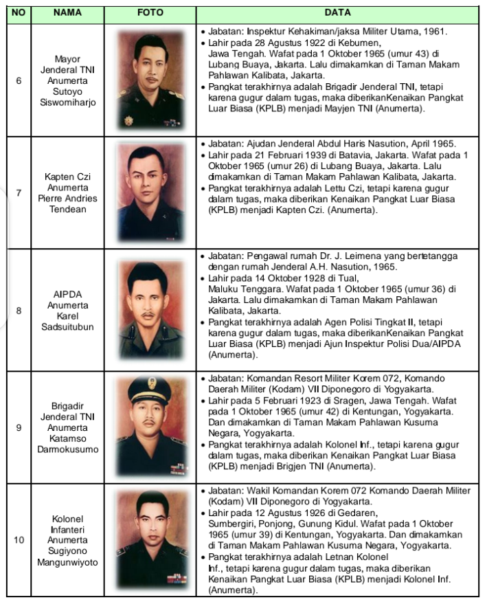 Parakan, Temanggung – Pahlawan Revolusi adalah gelar yang diberikan kepada sejumlah perwira militer yang gugur dalam tragedi pada tanggal 30 September 1965 malam dan 1 Oktober 1965 dini hari. Sejak berlakunya Undang-Undang Nomor 20 Tahun 2009, gelar ini diakui juga sebagai Pahlawan Nasional. Berikut data singkat para Pahlawan Revolusi tersebut.