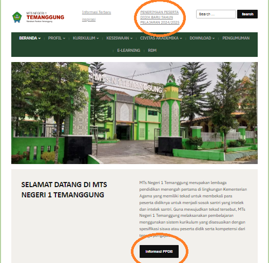 Temanggung_Telah dibuka Pendaftaran Peserta Didik Baru (PPDB) MTs Negeri 1 Temanggung Tahun Pelajaran 2024/2025 yang dilakukan secara online. Pendaftaran online bisa dilakukan dengan membuka laptop atau PC atau dengan ponsel pintar. Jika alat yang digunakan laptop atau PC, buka website resmi https://mtsn1temanggung.sch.id/ kemudian pilih menu “Informasi PPDB” atau “PENERIMAAN PESERTA DIDIK BARU TAHUN PELAJARAN 2024/2025”. Apabila dengan ponsel pintar, silakan pilih menu “Informasi PPDB”. Apabila ponsel pintar disetel “Situs Desktop” maka akan ada dua menu seperti membuka dengan laptop atau PC.