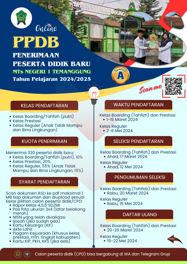 Informasi lebih mendalam, brosur Pendaftaran Peserta Didik Baru (PPDB) MTs Negeri 1 Temanggung Tahun Pelajaran 2024/2025 bisa diunduh di sini.