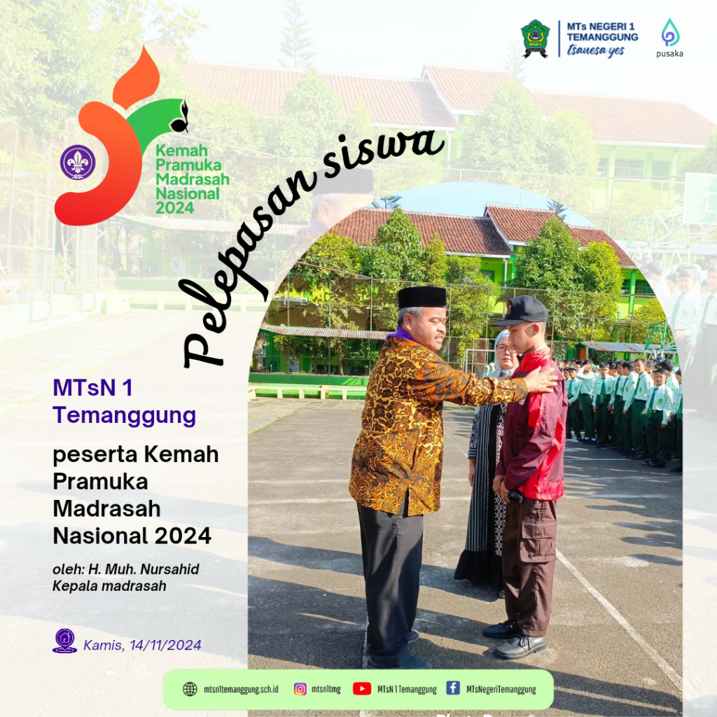 H. Muh. Nursahid, S.Pd, Kepala MTs Negeri ! Temanggung dalam apel pada Kamis (14/11/2024) yang diikuti oleh guru karyawan san seluruh siswa berkenan melepas keikutsertaan Faiz Syafiarrahman dari Kelas 8C untuk mengikuti Kemah Pramuka Madrasah Nasional (KPMN) Tahun 2024 yang berlangsung di Cibubur, Jakarta pada 17-22 November 2024.