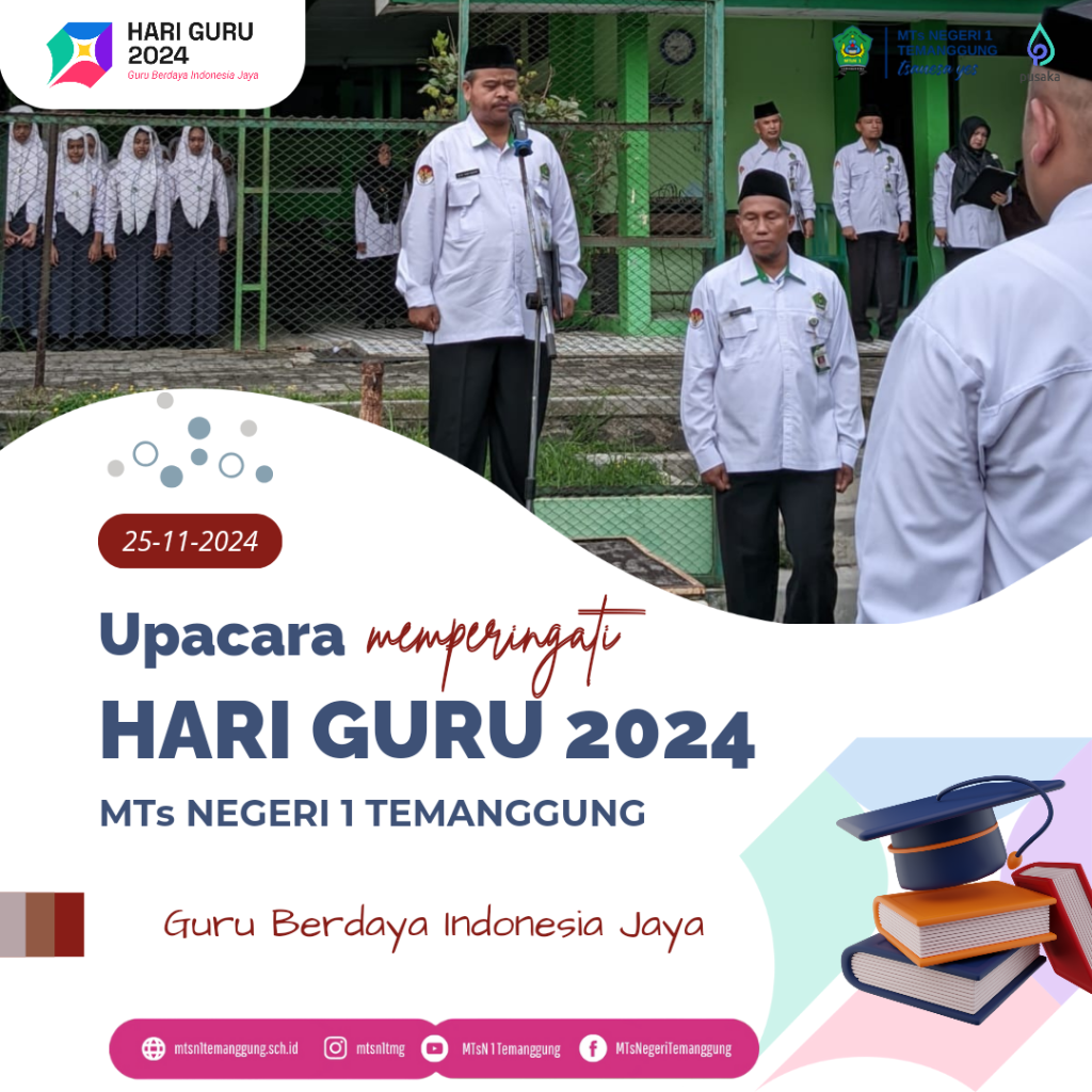 Kepala MTs Negeri 1 Temanggung, H. Muh. Nursahid, S,Pd pada Senin (25/11/2024) bertempat di lapangan olahraga madrasah memimpin upacara memperingati Gari Guru Nasional Tahun 2024 yang mengusung tema “Guru Berdaya Indonesia Jaya”, dengan petugas upacara berasal dari unsur guru dan diikuti oleh seluruh siswa. Momentum Hari Guru Nasional tahun ini, “Kepada bapak ibu guru, mohon tingkatkan kinerja guru demi keberhasilan proses pendidikan di madrasah. Kepada siswa, agar lebih giat lagi dalam belajar demi masa depan kalian”, demikian ajaknya dalam amanat upacara.