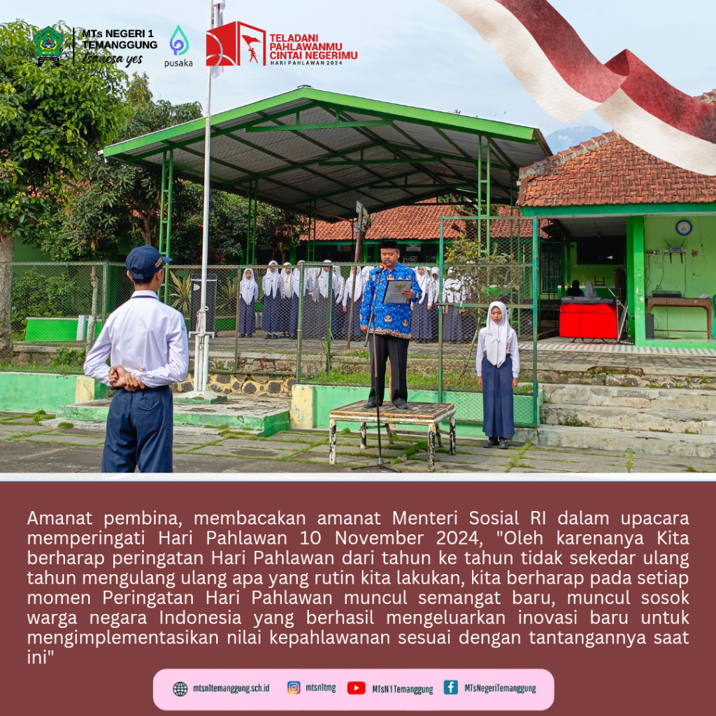 Kepala MTs Negeri 1 Temanggung, H. Muh. Nursadi, S.Pd memimpin upacara memperingati Hari Pahlawan 10 November 2024 dengan mengusung tema “Teladani Pahlawanmu Cintai Negerimu” yang diikuti oleh guru karyawan dan seluruh siswa. Dalam amanatnya, Pak Sahid, demihian sapaan akrabnya membacakan amanat Meneteri Sosial RI.
