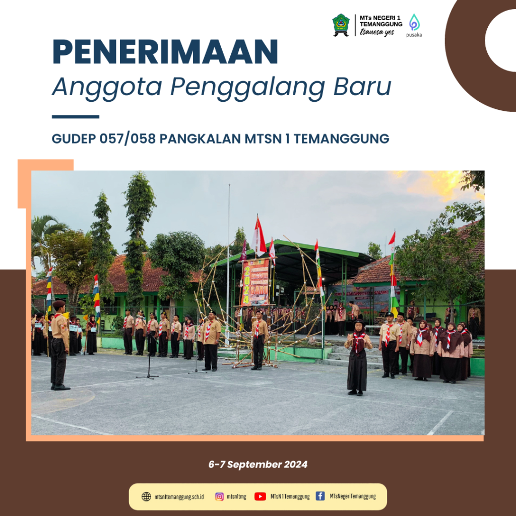 Pramuka Penggalang Gugus Depan 057/058 Pangkalan MTs Negeri 1 Temanggung yang dinahkodahi Kak Sri Susiati pada Jum’at-Sabtu (6-7/9/2024) mengadakan kegiatan PERJUMSA (Perkemahan Jum’at Sabtu) dengan agenda pokok kegiatan menerima anggota penggalang baru dari siswa kelas tujuh. Perjumsa ini sendiri dilaksanakan di pangkalan MTs Negeri 1 Temanggung ditambah kegiatan alam ke luar madrasah.