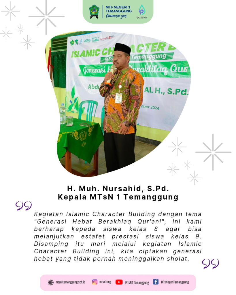 H. Muh. Nursahid, S.Pd., Kepala MTs Negeri 1 Temanggung dalam sambutannya menyatakan “Kegiatan Islamic Character Building dengan tema Generasi Hebat Berakhlaq Qur’ani ini kami berharap siswa kelas delapan menyambut estafet prestasi siswa kelas sembilan. Kami berharap juga agar terbentuk akhlak-akhlak mulia sesuai dengan tema yang ada. oleh karena itu, mari kita ciptakan generasi hebat yang tidak pernah meninggalkan sholat!”.